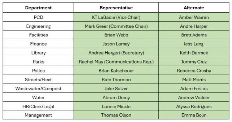 The purpose of the Safety Committee is to promote and maintain workplace safety for City employee’s and to make safety an essential focus of the City’s operating procedures, culture, and programs. The Safety Committee members main role is to educate employees and supervisors about safety issues, new safety standards, and to provide free discussion of safety problems and to identify solutions.