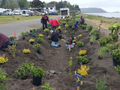 The above photo shows volunteers planting a rain garden in the ROW.